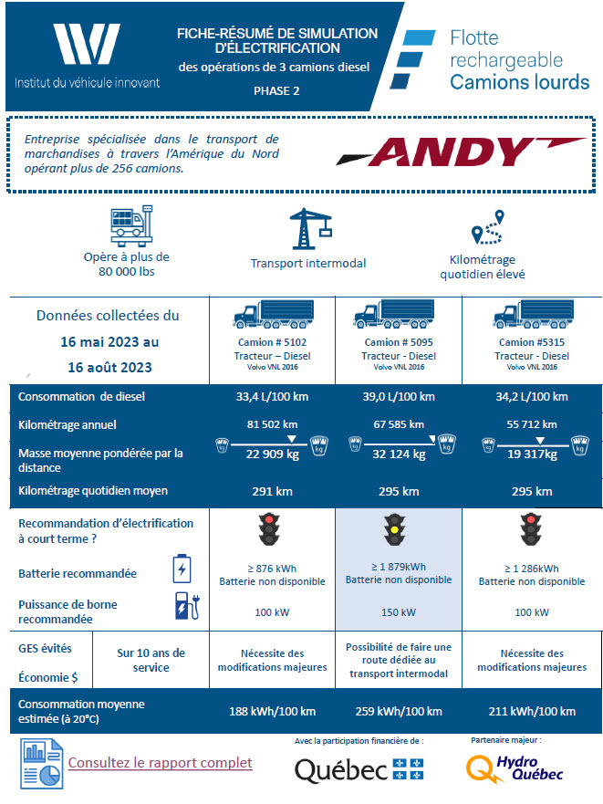 Le second volet du projet permet à vingt (20) entreprises participantes de faire analyser les données d’utilisation sur une période de 3 mois en vue de déterminer le niveau de compatibilité avec l’offre actuelle des camions électriques et d’obtenir un rapport technico-économique personnalisé pour amorcer leur transition.